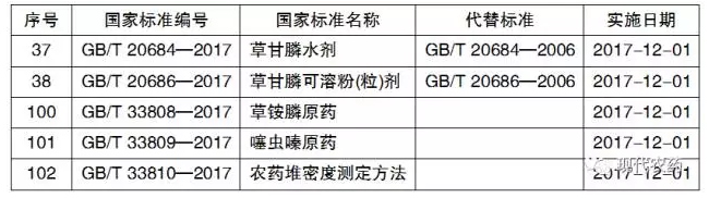 表2 2017年第18号公告中批准的和农药相关的标准
