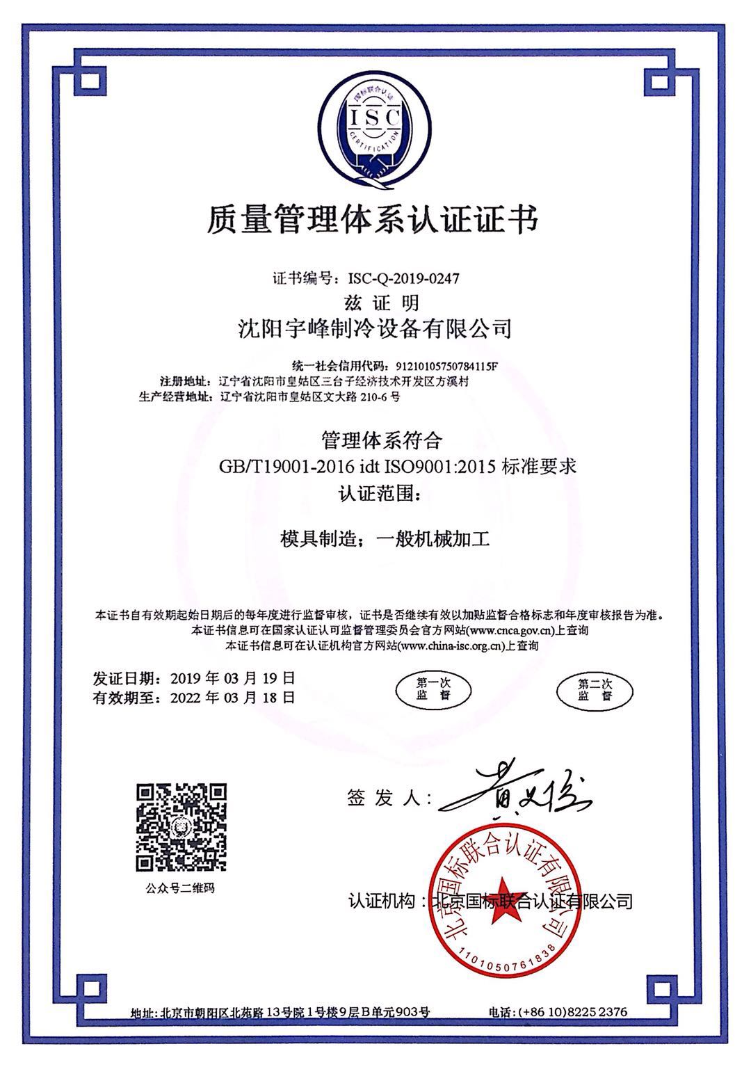 沈阳宇峰制冷设备有限公司本次成功通过质量管理体系认证,符合GB/T19001-2016 idt ISO9001:2015的标准要求。