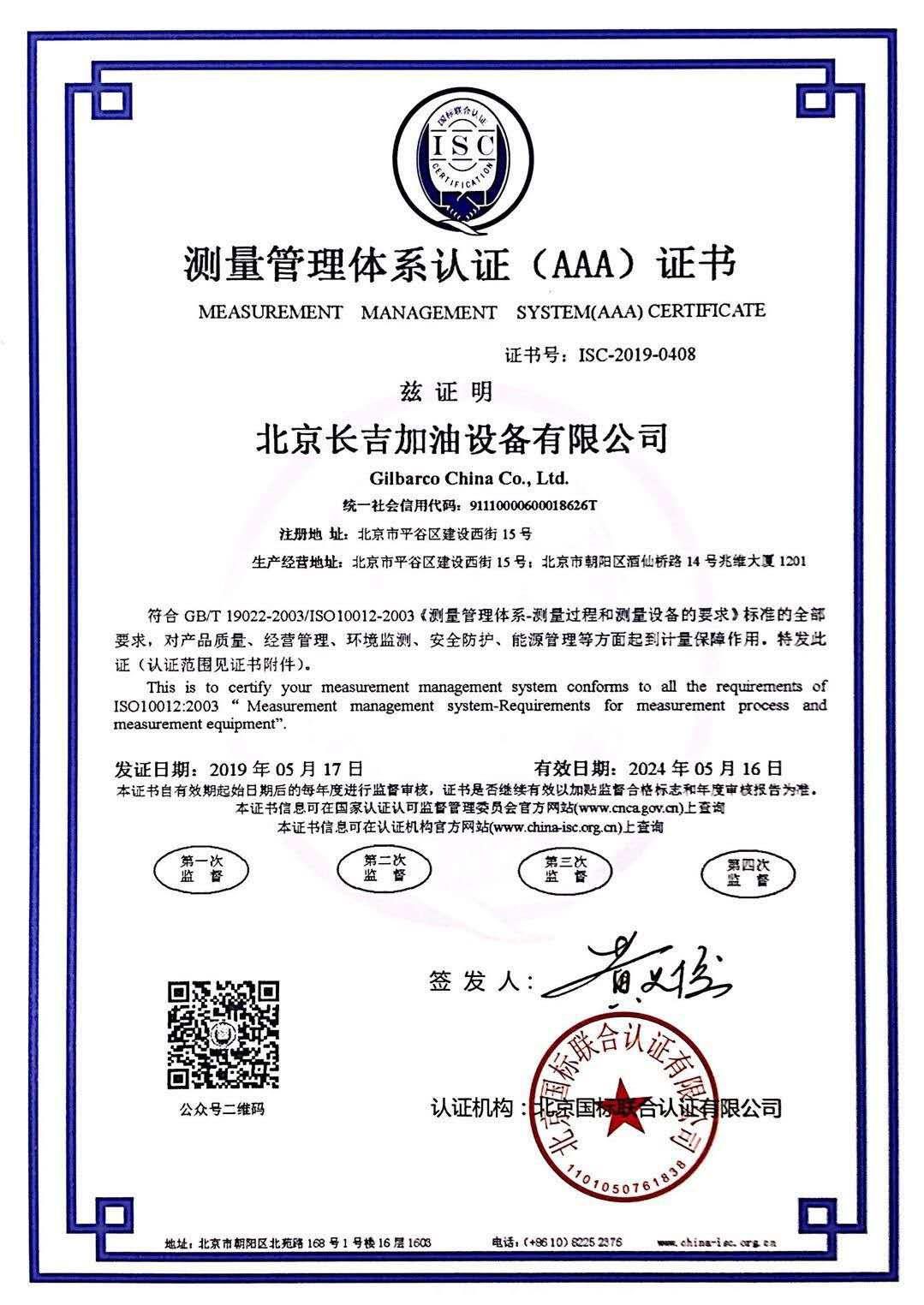 北京长吉加油设备有限公司本次成功通过测量管理体系认证,符合GB/T19022-2003/ISO10012:2003的标准要求,证明了该公司在产品质量、经营管理、环境监测、安全防护、能源管理等方面起到计量保障作用。