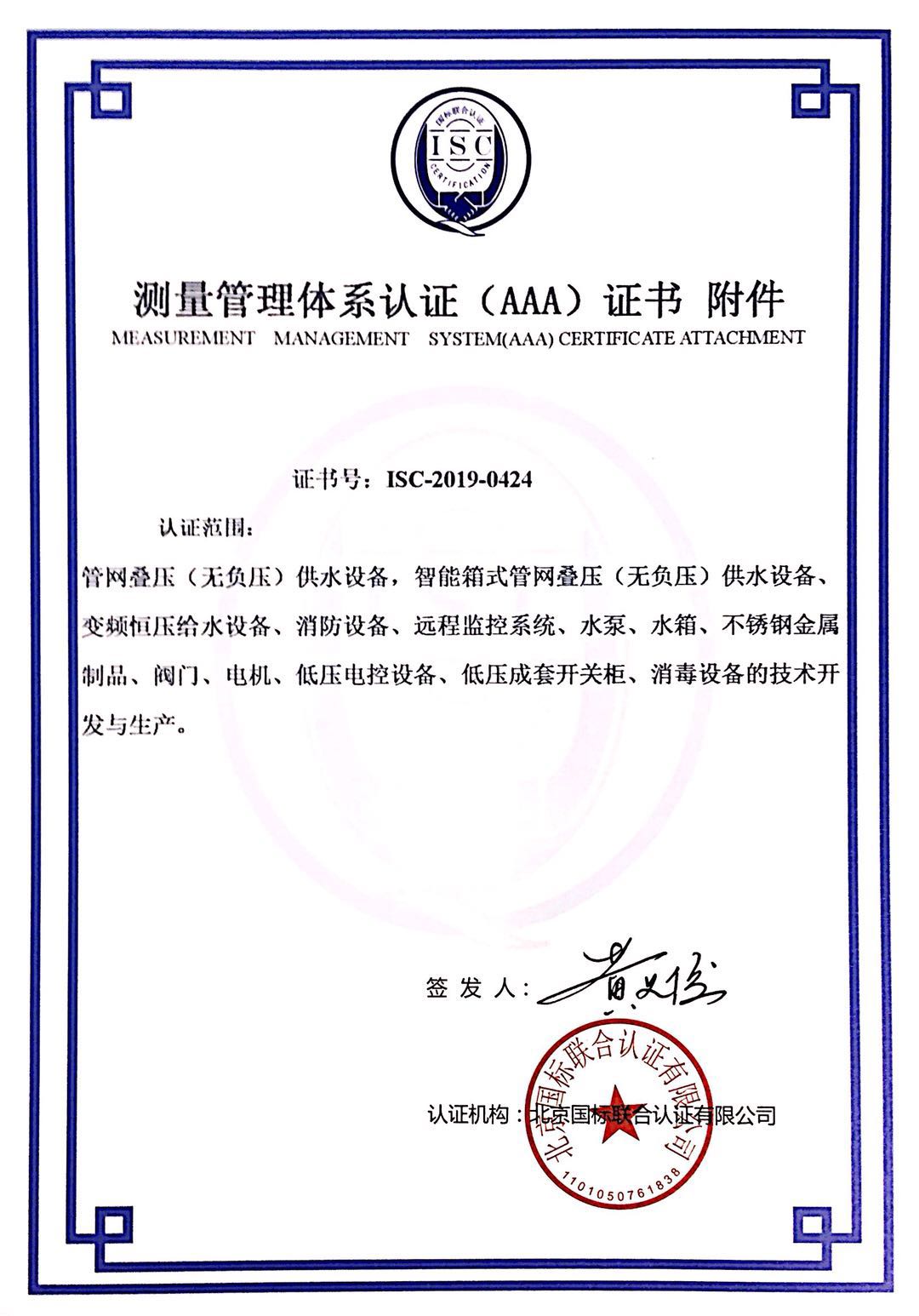 浙江南方智慧水务有限公司喜获“测量管理体系认证(AAA)证书”