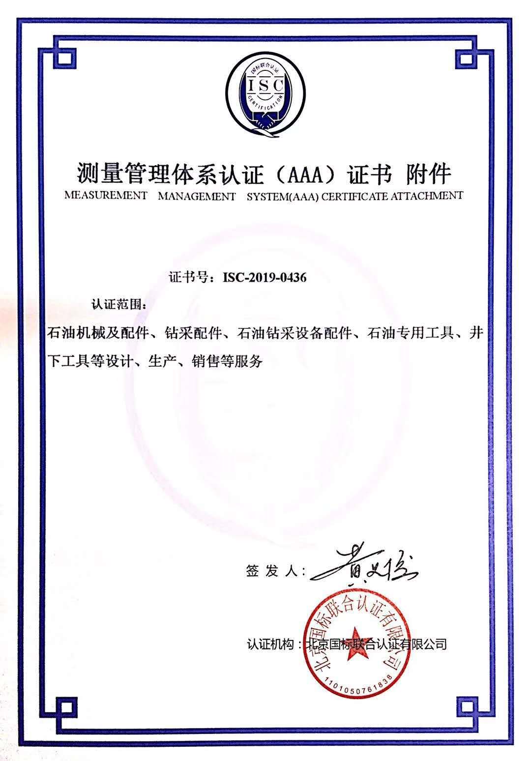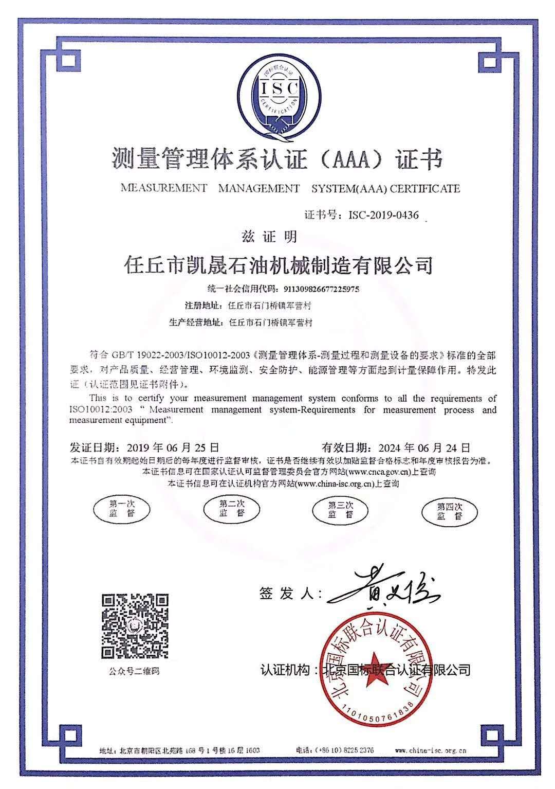 任丘市凯晟石油机械制造有限公司本次成功通过测量管理体系认证,符合GB/T19022-2003/ISO10012:2003的标准要求,证明了该公司在产品质量、经营管理、环境监测、安全防护、能源管理等方面起到计量保障作用。