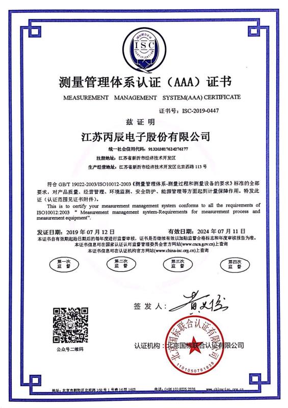 江苏丙辰电子股份有限公司本次成功通过测量管理体系认证,符合GB/T19022-2003/ISO10012:2003的标准要求,证明了该公司在产品质量、经营管理、环境监测、安全防护、能源管理等方面起到计量保障作用。