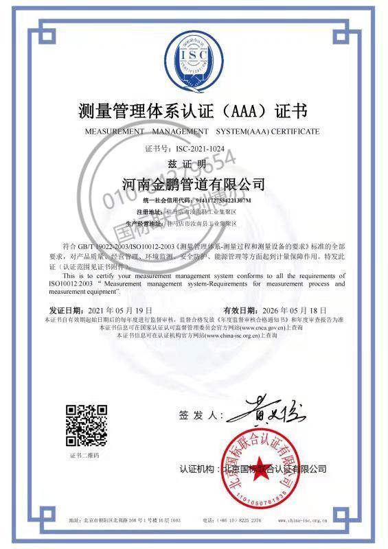 河南金鹏管道有限公司本次成功通过测量管理体系认证,符GB/T19022-2003/ISO10012:2003的标准要求,证明了该公司在产品质量、经营管理、环境监测、安全防护、能源管理等方面起到计量保障作用。