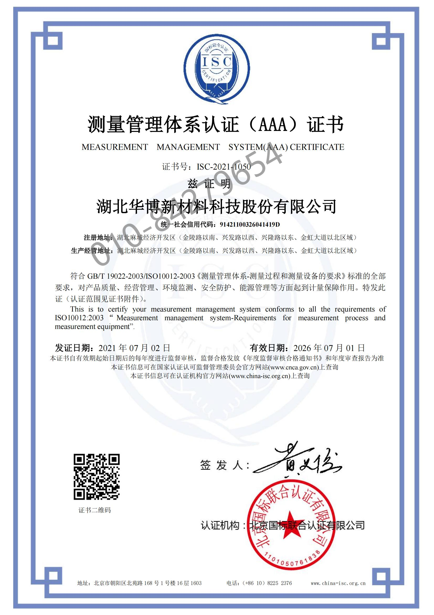 湖北华博新材料科技股份有限公司本次成功通过测量管理体系认证,符GB/T19022-2003/ISO10012:2003的标准要求,证明了该公司在产品质量、经营管理、环境监测、安全防护、能源管理等方面起到计量保障作用。