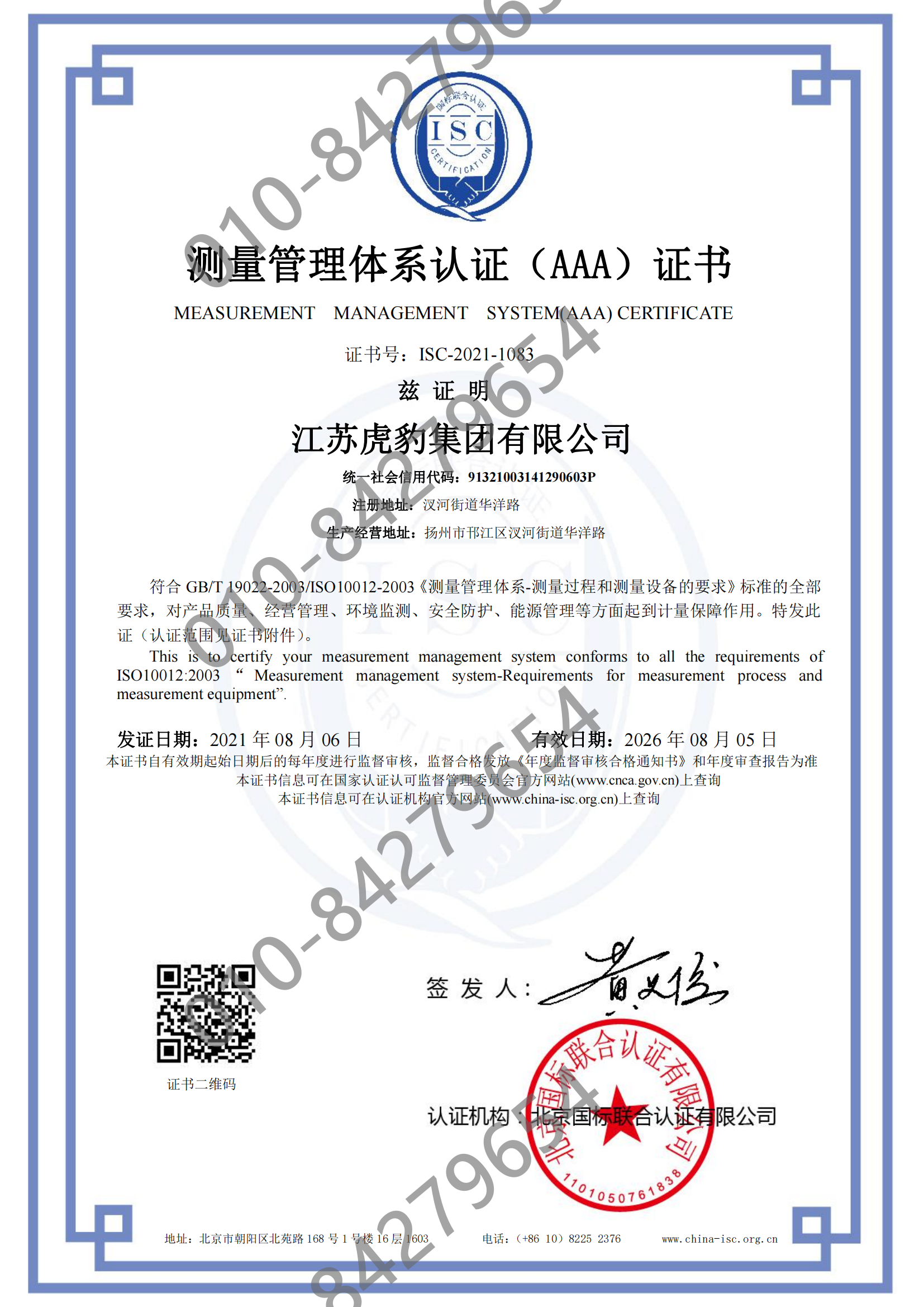 江苏虎豹集团有限公司本次成功通过测量管理体系认证,符GB/T19022-2003/ISO10012:2003的标准要求,证明了该公司在产品质量、经营管理、环境监测、安全防护、能源管理等方面起到计量保障作用。