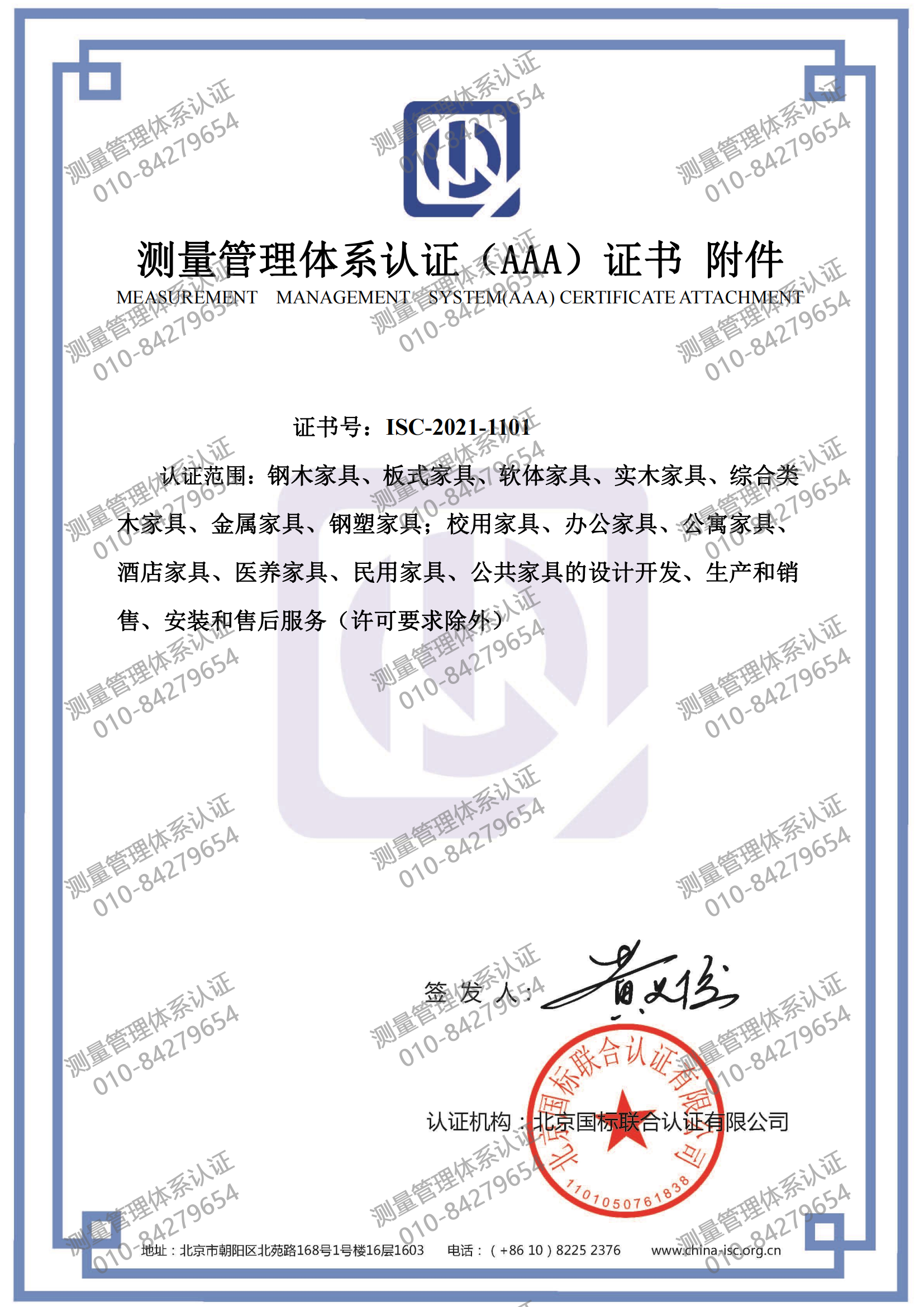 北京大为家具集团有限公司本次成功通过测量管理体系认证,符GB/T19022-2003/ISO10012:2003的标准要求,证明了该公司在产品质量、经营管理、环境监测、安全防护、能源管理等方面起到计量保障作用。
