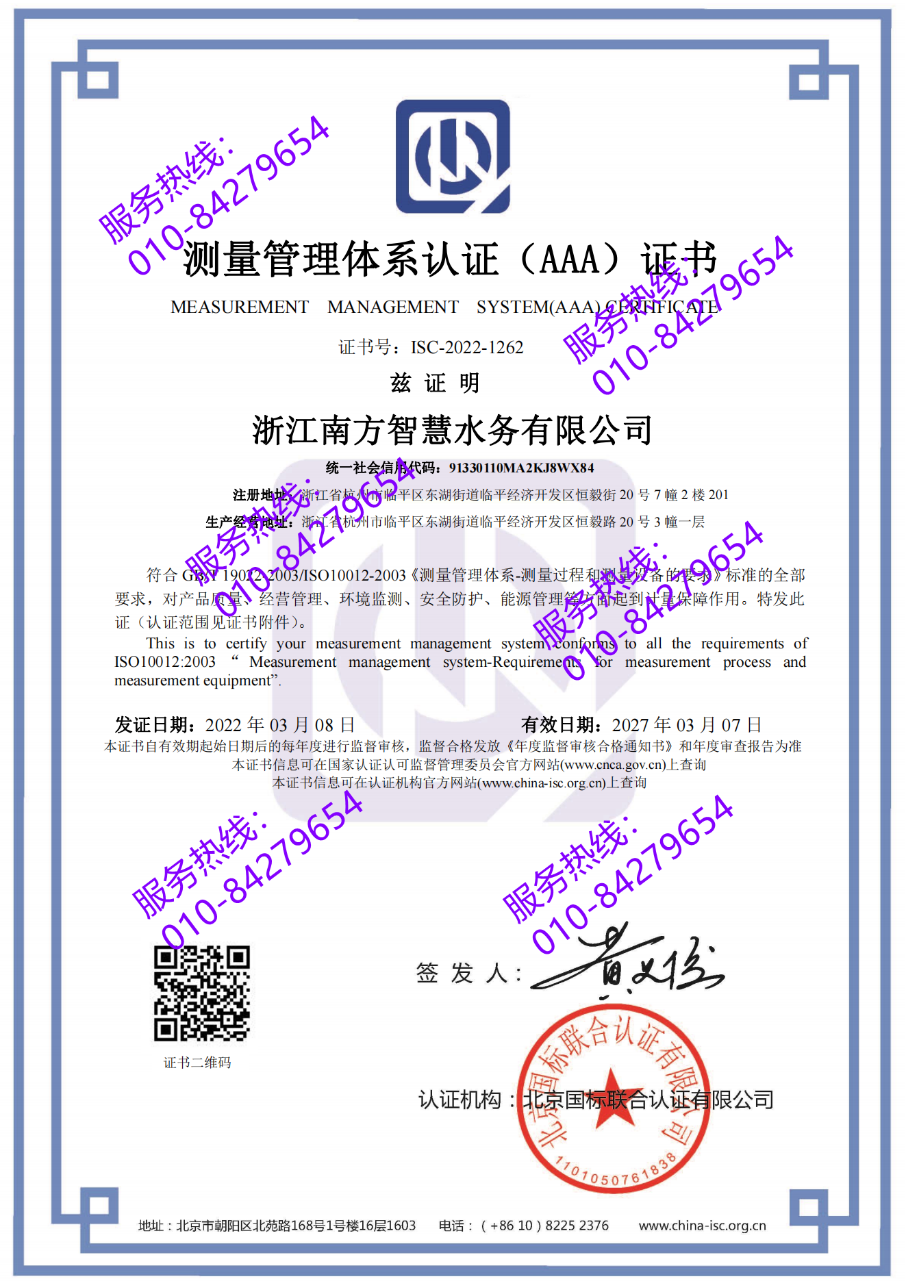 浙江南方智慧水务有限公司喜获“测量管理体系认证(AAA)证书”