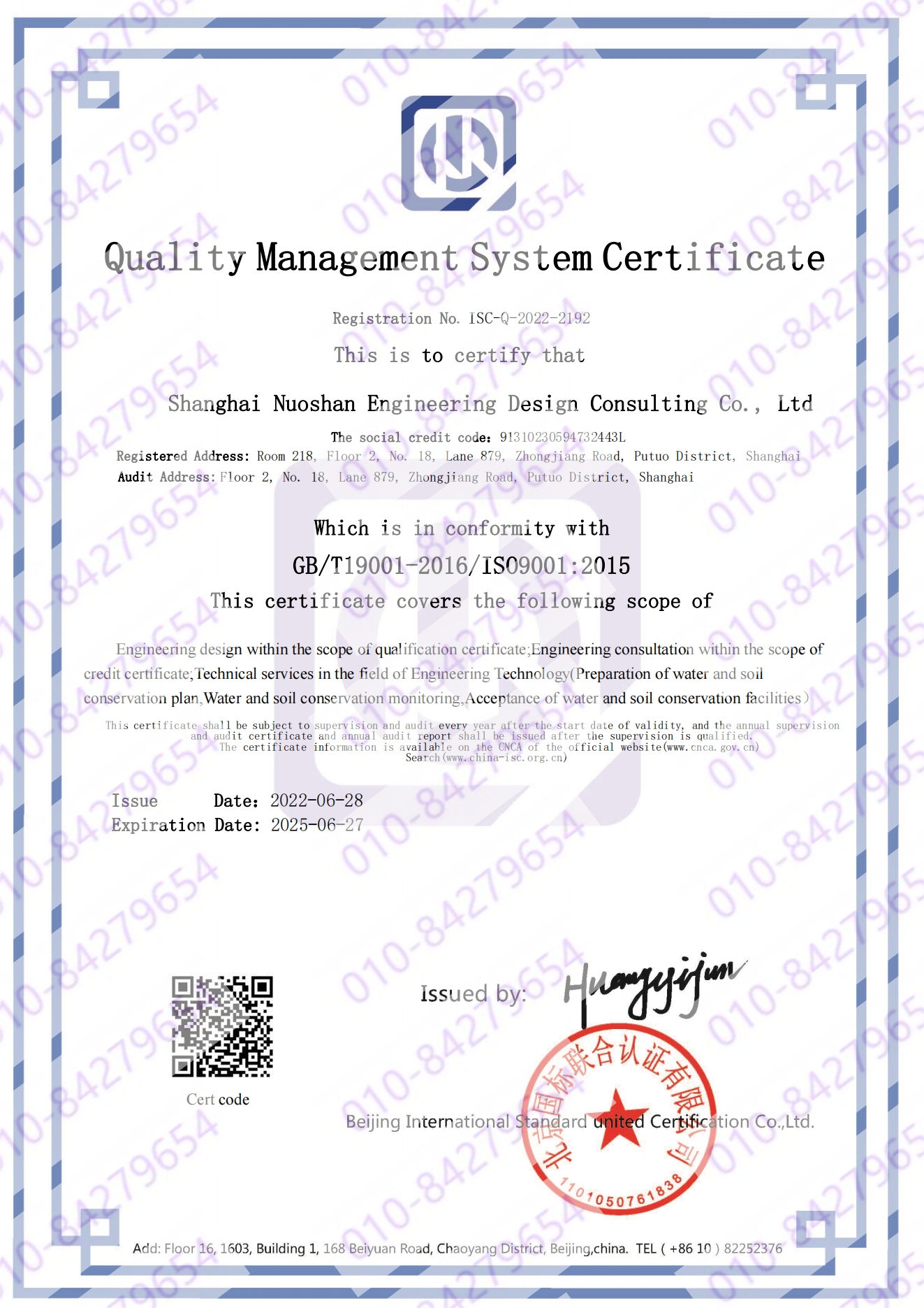 上海诺山工程设计咨询有限公司 喜获 “三体系认证证书”