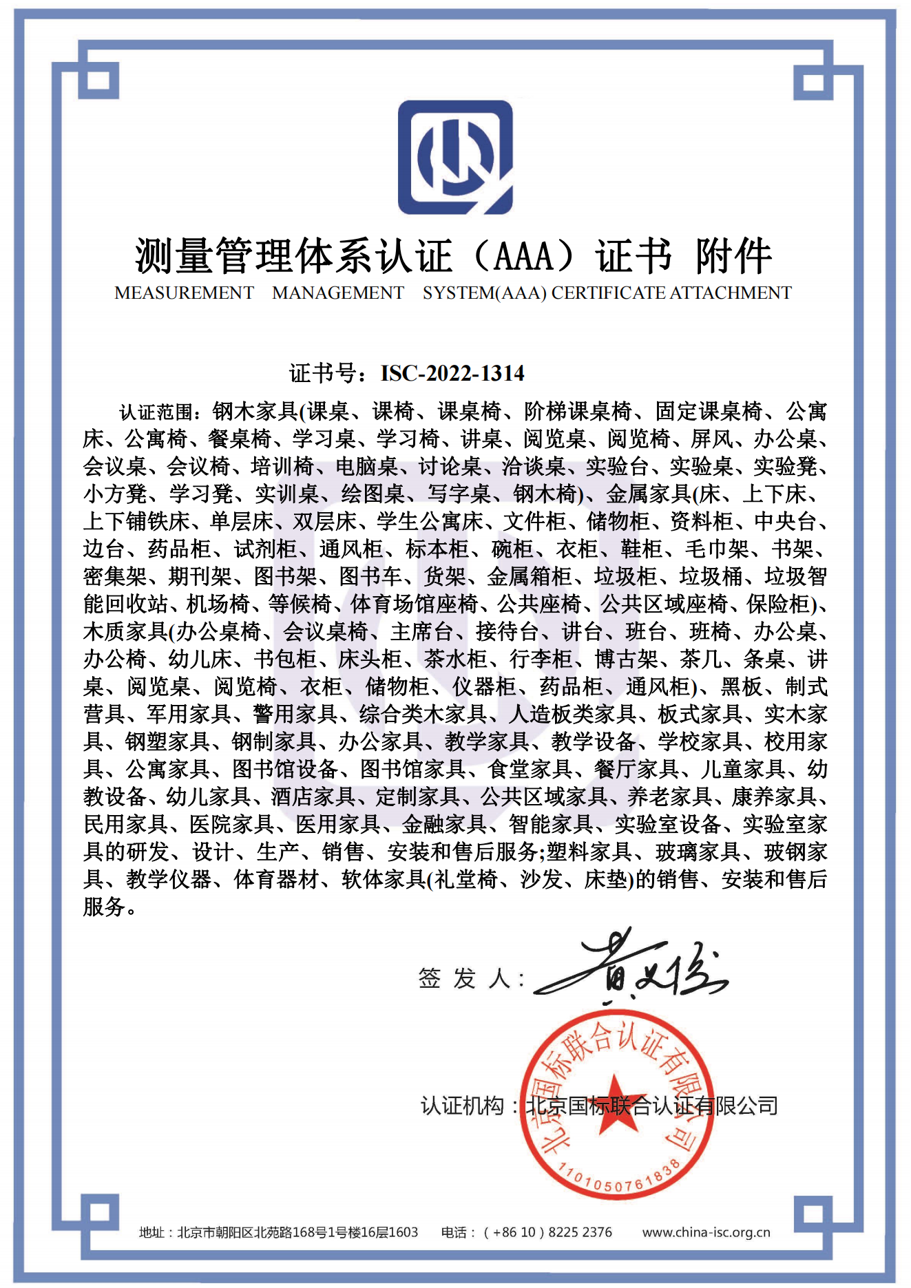 北京辉煌家具集团有限公司 喜获“测量管理体系认证(AAA)证书”