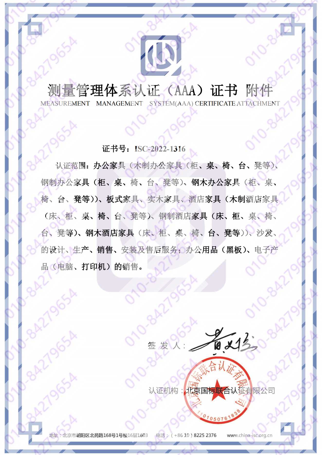 北京辉煌家具集团有限公司 喜获“测量管理体系认证(AAA)证书”