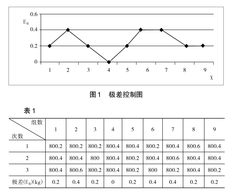 铜排进厂验收采用直接称重的方法,测量设备是一台测量范围为1000kg、分度值为0.2kg的三级电子吊秤。根据JJG539-2016《数字指示秤检定规程》,该秤的最大允许误差可达±0.3kg。为保证测量准确性,该公司利用核查标准和控制图,采用统计技术,对测量过程的全部要素按规定的程序和时间间隔实施测量过程监视。通过极差控制图(见图1),将测量结果的极差上限控制在0.4kg,如表1所示。
