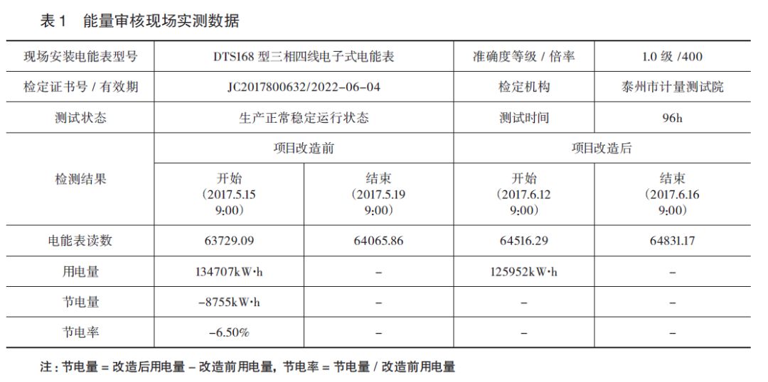 2017年3月泰州市被纳入项目节能量交易试点范围。泰州市计量测试院抓住机遇,成功成为江苏省第三批项目节能量交易第三方审核机构。该院在能源计量中着重打造“品质泰州·用心计量”服务品牌,充分利用项目节能量交易审核资质,主动与企业、节能主管部门等多渠道交流节能量审核信息。在开展节能量审核过程中,通过对项目改前、改后安装合格能源计量器具的方式,获取能源计量数据,核算节能量,切实引导企业重视能源计量对企业技改和节能减排发挥的作用。该院利用能源计量器具对某企业开展项目节能量审核现场实测数据,如表1所示。