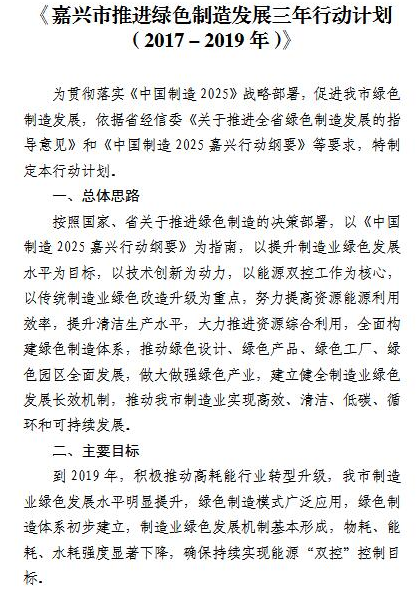 《嘉兴市推进绿色制造发展三年行动计划(2017-2019年)》印发