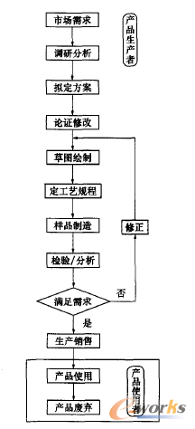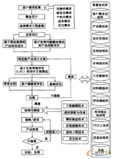 现代产品开发模式是面向产品的整个生命周期过程(需求分析、设计构思、产品设计、制造、使用以及废弃和回收)的设计。它依据环境效益和生态环境指标与产品性能、质量及成本要求,利用三维软件完成产品的虚拟创建、修改、装配、仿真等一系列操作,最后通过先进的数字化技术进行量产,实现了产品研制过程各部门数据信息的“零误差”传递和并行、协同¨。现代产品设计过程(如图2)遵循了“资源一产品一消费一回收再制造”的循环经济发展方式,根据绿色设计的4R(reduce,reuse,recycle,regenerate)原则,使资源在经济循环中得到了合理、高效、持久的利用,达到生态建设与经济发展“双赢”的局面。同时,建立丰富的资源知识数据库,通过基于相似案例和发明问题解决理论的产品绿色创新设计方法,提高新产品的研制与开发效率,实现产品的绿色设计和制造。