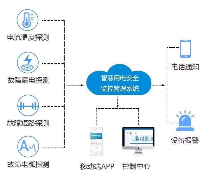 基于物联传感、移动互联、云计算技术及大数据等现代信息技术,由智能终端、无线传输设备,通过智能传感终端(现场监控模块、传输模块),将引起电气火灾的主要因素(线缆温度、电流、剩余电流、故障电弧)进行实时在线监测,统计分析,汇总为电气安全数据。