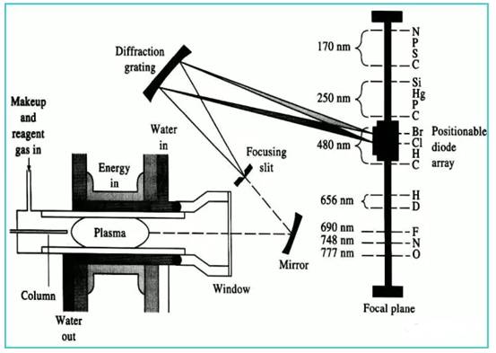 它是利用等离子体作激发光源,使进入检测器的被测组分原子化,然后原子被激发至激发态,再跃迁至基态,发射出原子光谱。根据这些线光谱的波长和强度即可进行定性和定量分析。