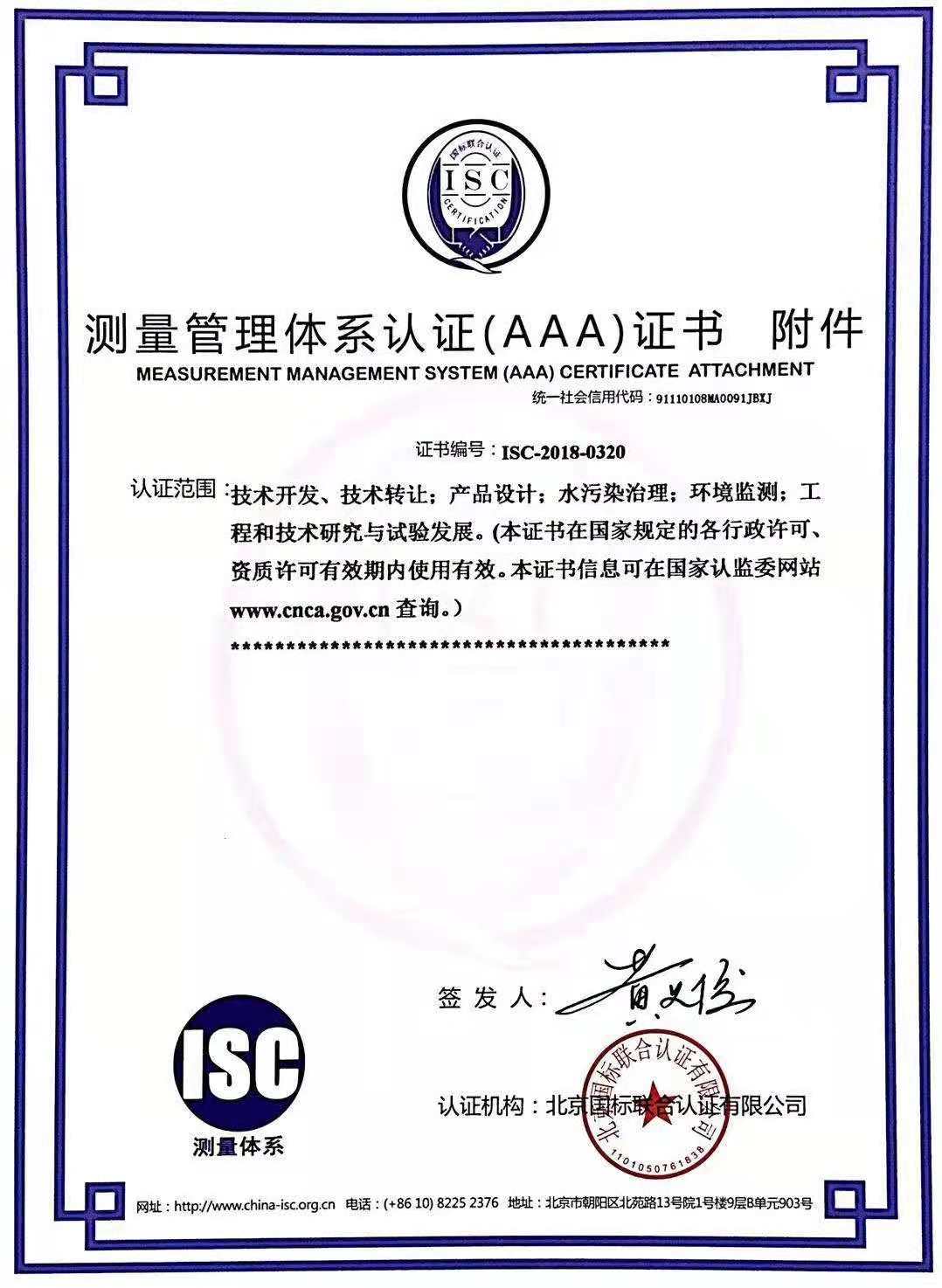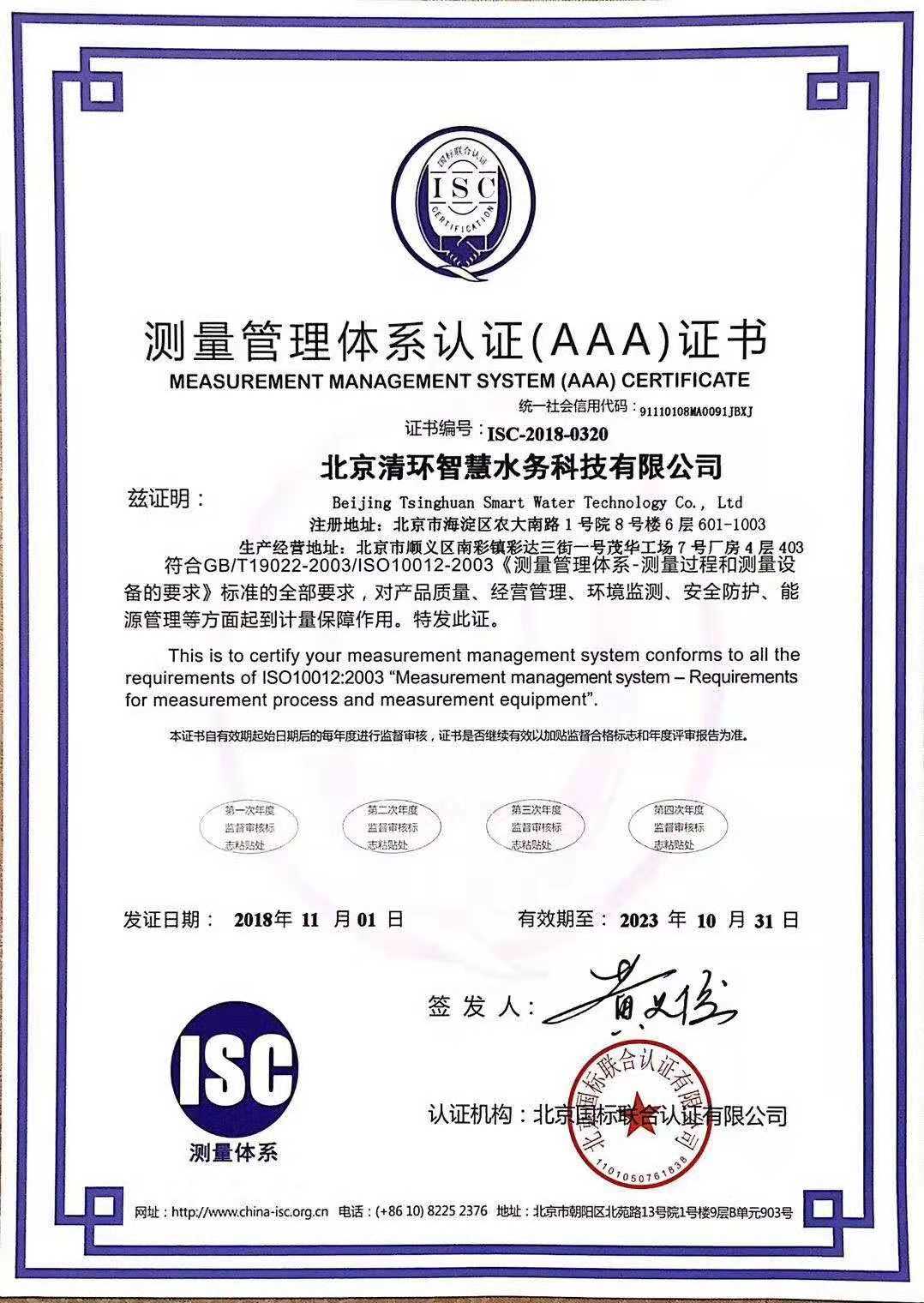 北京清环智慧水务科技有限公司本次成功通过测量管理体系认证,符合GB/T19022-2003/ISO10012:2003的标准要求,证明了该公司在产品质量、经营管理、环境监测、安全防护、能源管理等方面起到计量保障作用。