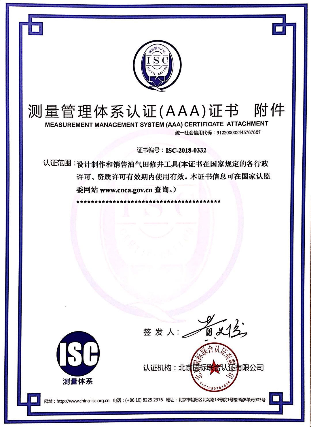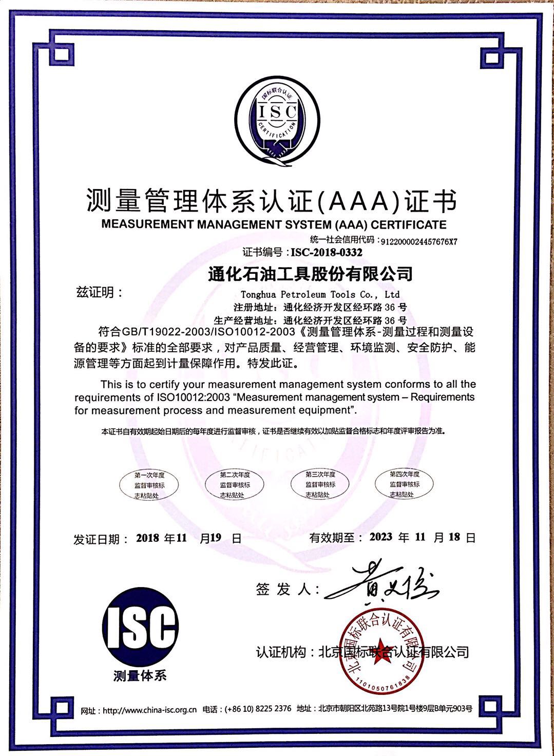 通化石油工具股份有限公司本次成功通过测量管理体系认证,符合GB/T19022-2003/ISO10012:2003的标准要求,证明了该公司在产品质量、经营管理、环境监测、安全防护、能源管理等方面起到计量保障作用。