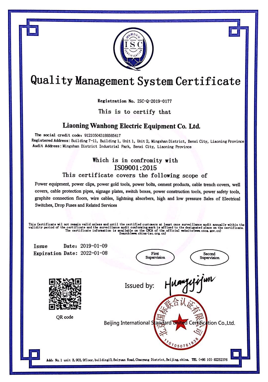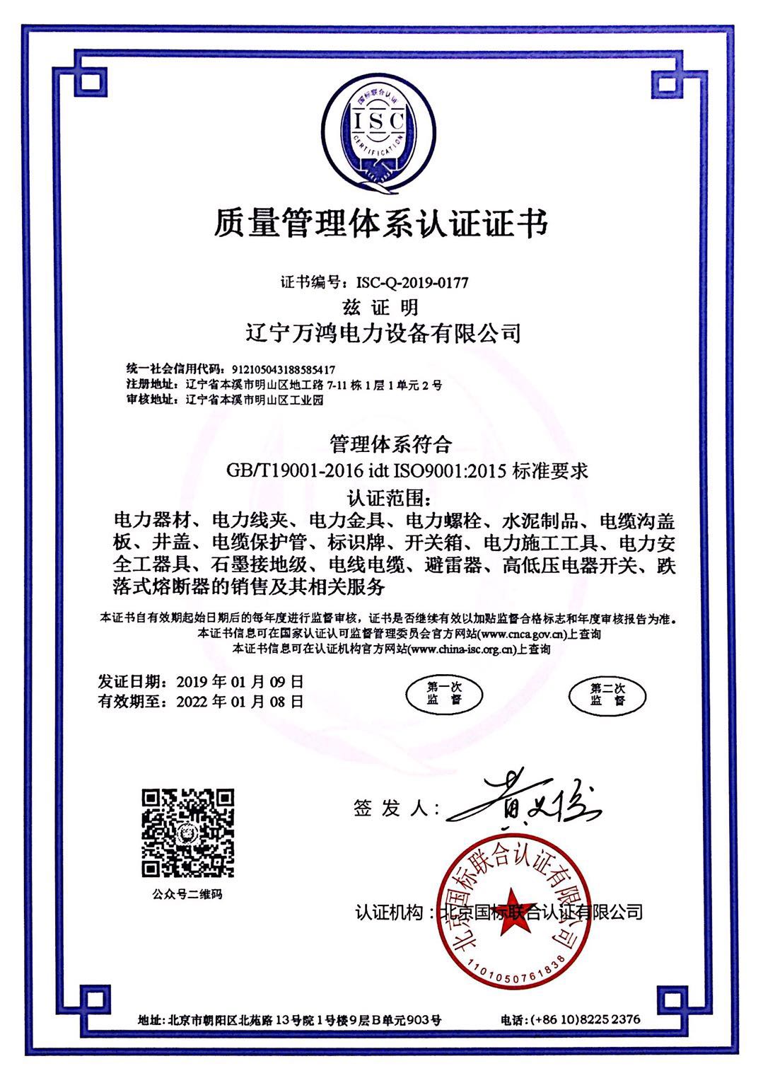 辽宁万鸿电力设备有限公司本次成功通过质量管理体系认证,符合GB/T19001-2016 idt ISO90012015的标准要求。