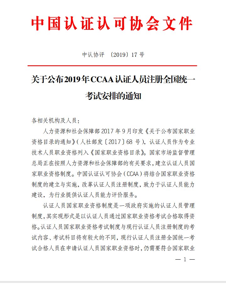 CCAA2019年度认证人员注册全国统一考试安排如下: