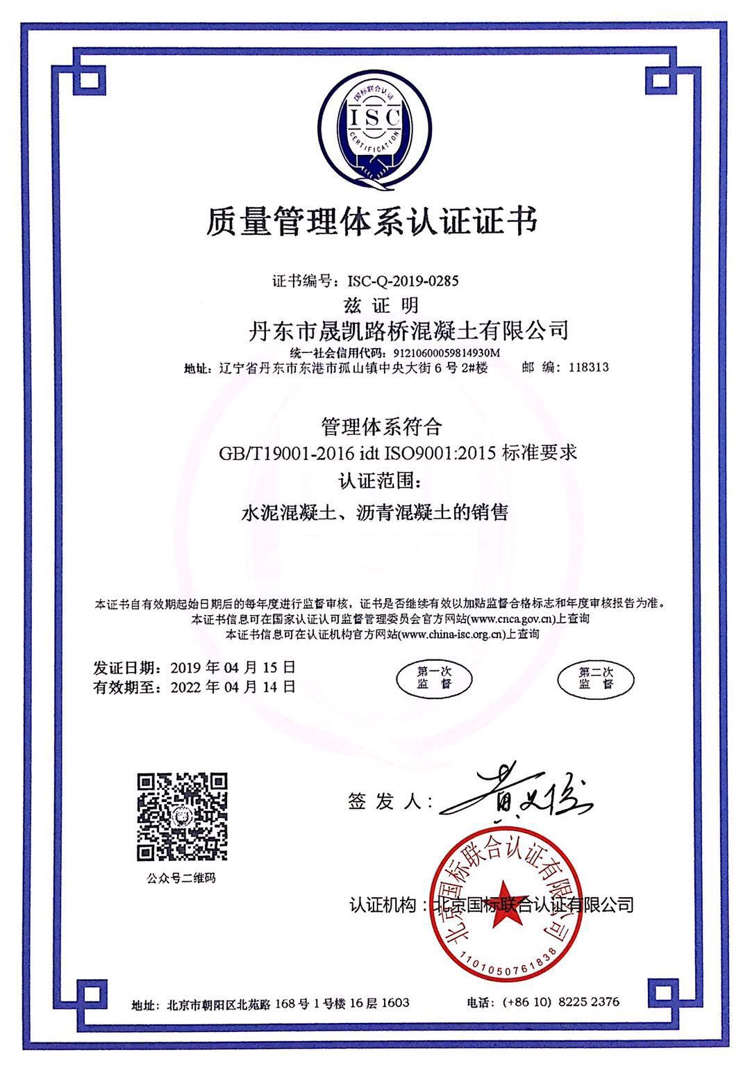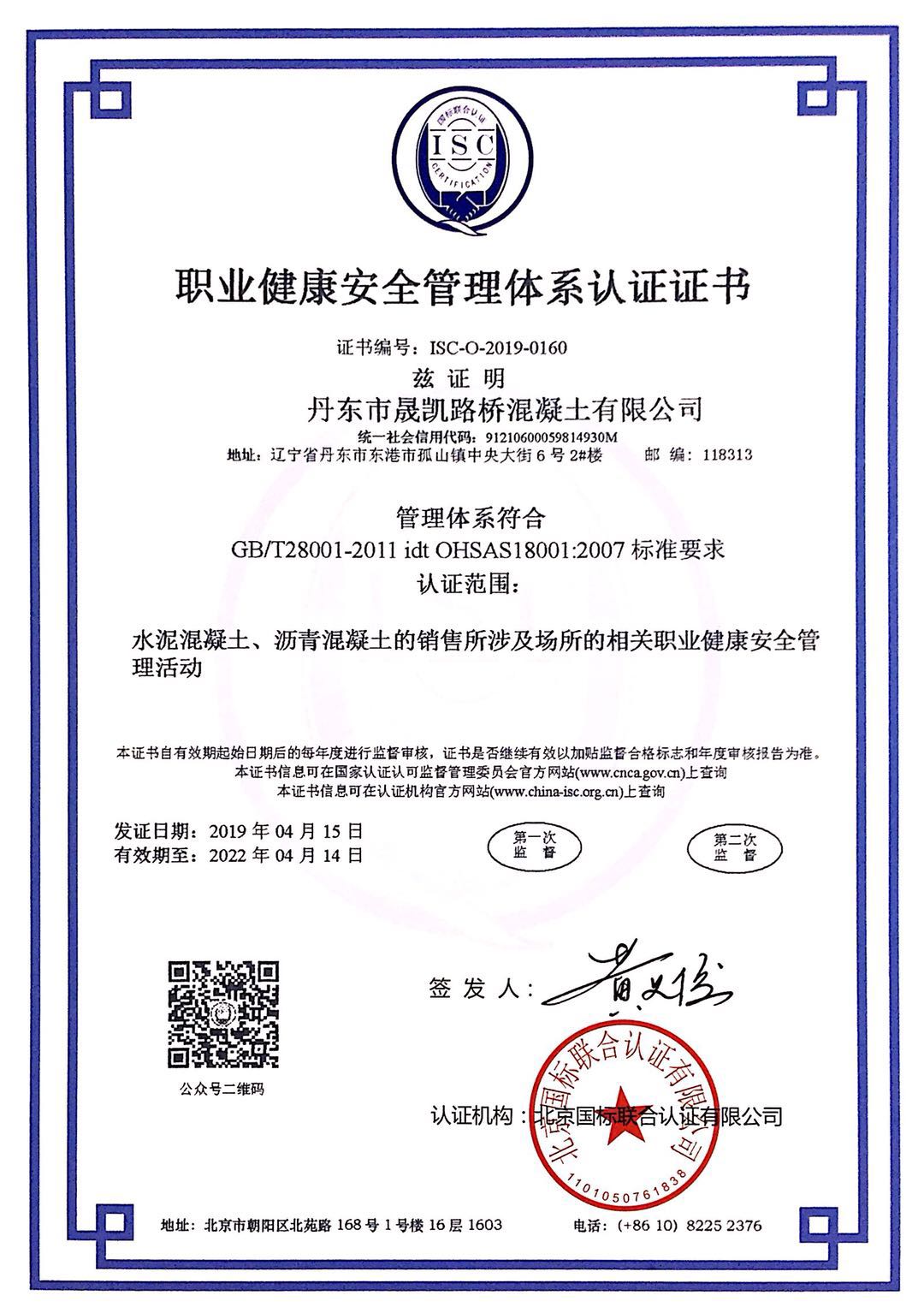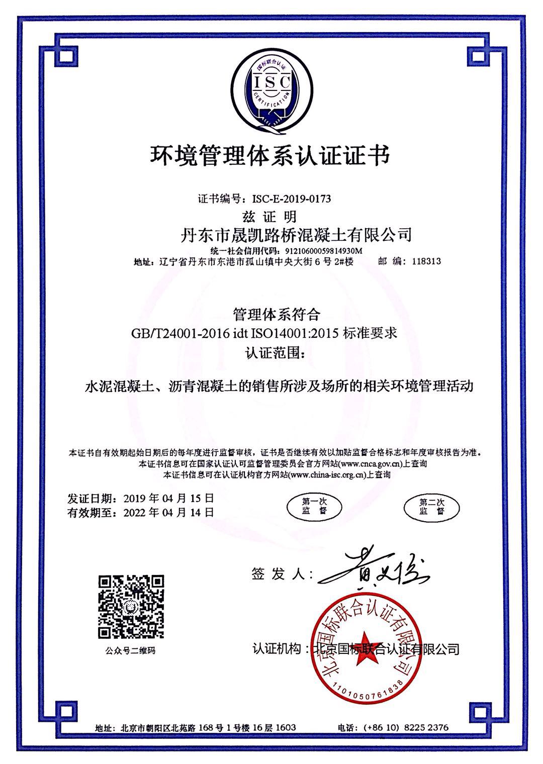 丹东市晟凯路桥混凝土有限公司本次成功通过环境管理体系认证、质量管理体系认证和职业健康安全管理体系认证,符合GB/T24001-2016 idt ISO14001:2015、GB/T19001-2016 idt ISO9001:2015和GB/T28001-2011 idt OHSAS18001:2007的标准要求。