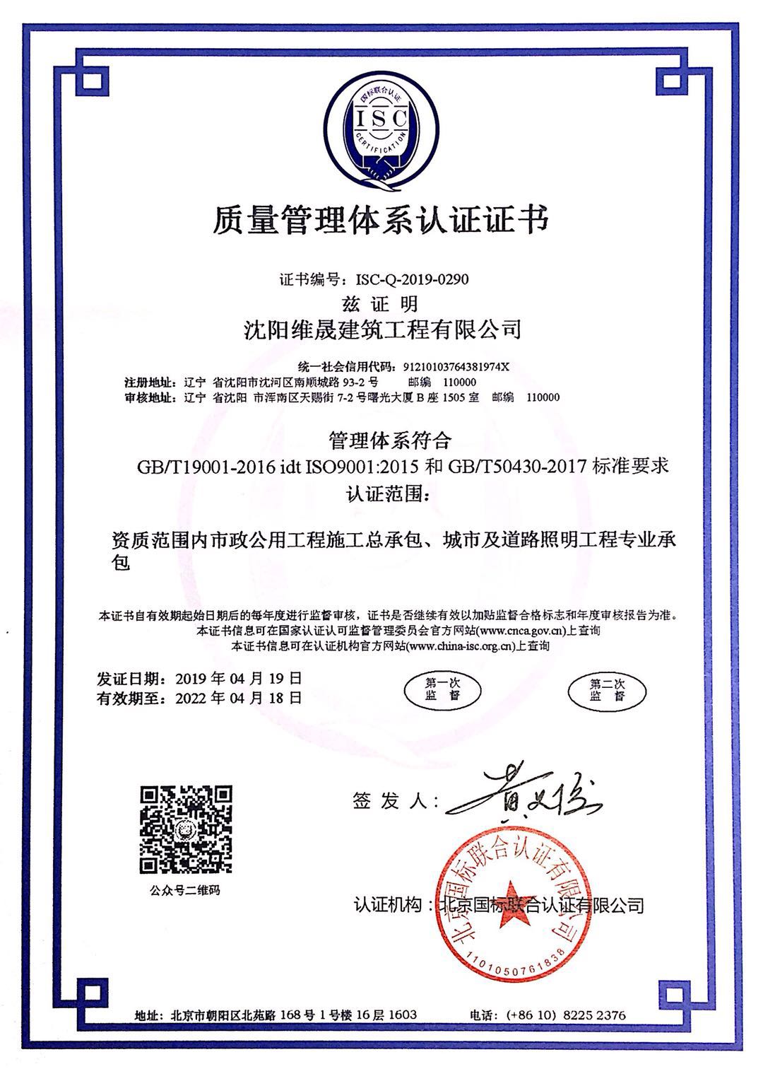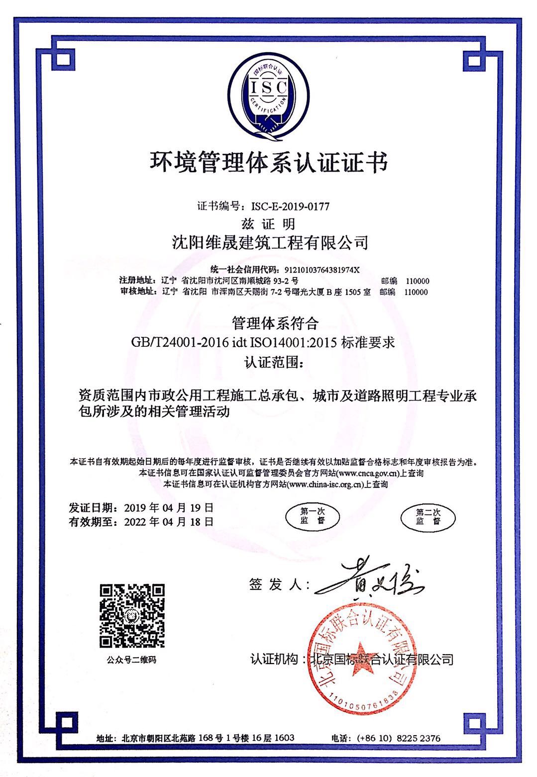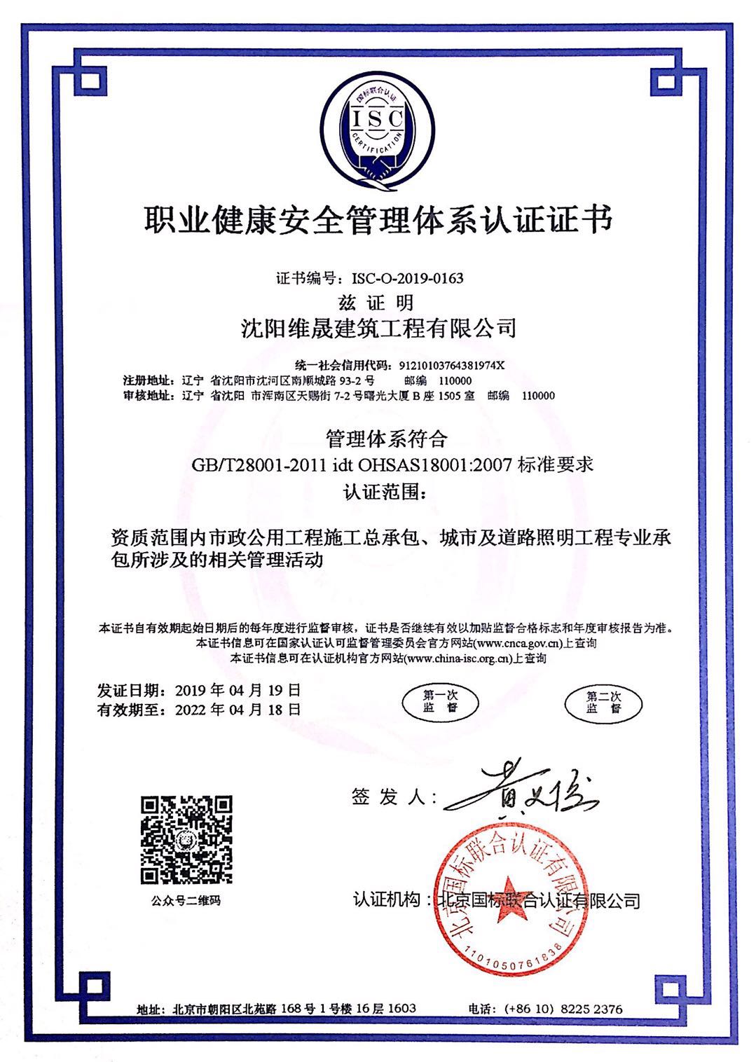 沈阳维晟建筑工程有限公司本次成功通过环境管理体系认证、质量管理体系认证和职业健康安全管理体系认证,符合GB/T24001-2016 idt ISO14001:2015、GB/T19001-2016 idt ISO9001:2015和GB/T28001-2011 idt OHSAS18001:2007的标准要求。