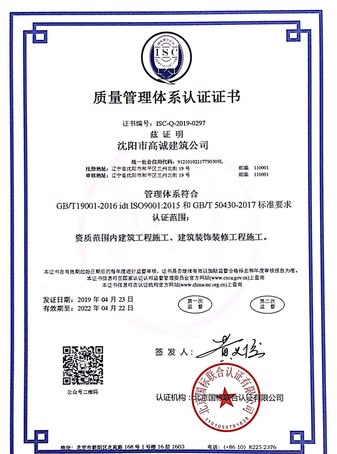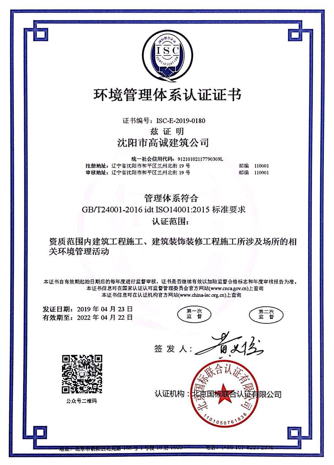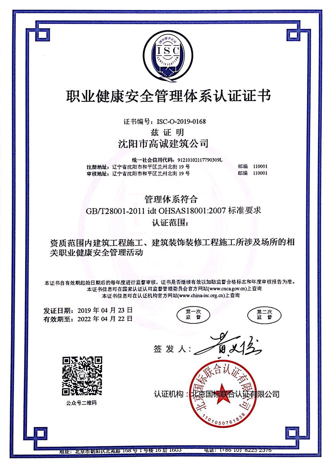 沈阳市高诚建筑公司本次成功通过环境管理体系认证、质量管理体系认证和职业健康安全管理体系认证,符合GB/T24001-2016 idt ISO14001:2015、GB/T19001-2016 idt ISO9001:2015和GB/T28001-2011 idt OHSAS18001:2007的标准要求。