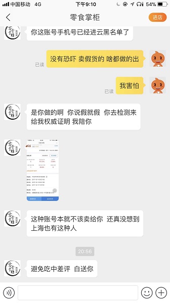 更令黄小姐恼怒的,是商家恶劣的服务态度。“请你们出具进货单和代理证明。”在黄小姐同客服联系沟通后,这家名为“零食掌柜”的店铺客服竟然回复说:“呵呵,原来是找麻烦的,要么原封退货给我,可以退钱,想打开白吃,你想多了。”商家冷嘲热讽的态度,令她气不打一处来。“首先,我并不缺这42元,另外,对于这样态度恶劣的商家,平台是怎么监管的?”没想到,商家却不依不饶,竟“回怼”称:“你这账号手机号已经进云黑名单了,本就不该卖给你这种账号。”