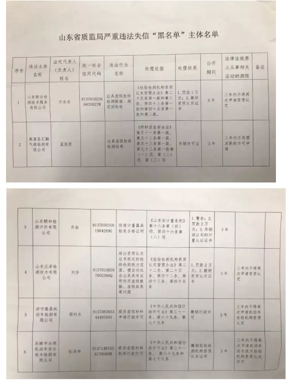 2018年7月27日,山东省质监局发布首批严重违法失信“黑名单”,山东新业检测技术服务有限公司等6家企业上被通报。据悉,被通报企业将面临罚款、撤销资质认定证书或吊销许可证等惩戒结果。
