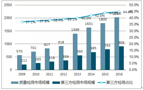 我国检验检测市场高速增长,其中,第三方检测达近千亿规模,2009-2016年复合增速高达23%。我国近年持续加大食品、环境、医药及工业等领域产品质量把控。检测覆盖领域持续扩大,检测项目也不断细化,检测行业持续高速发展。根据统计,截至2016年,我国检测行业市场规模达2028亿元,其中第三方检测达908亿元,2009-2016年第三方检测市场规模复合增速高达23%,第三方检测占比由2009年的37%提升至2016年的45%。
