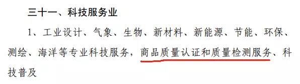 经查阅《产业结构调整指导目录(2019年本,征求意见稿)》全文,质量认证和检验检测服务、标准化服务、计量测试等被列入鼓励类第三十一大类科技服务业第一小类。截图如下: