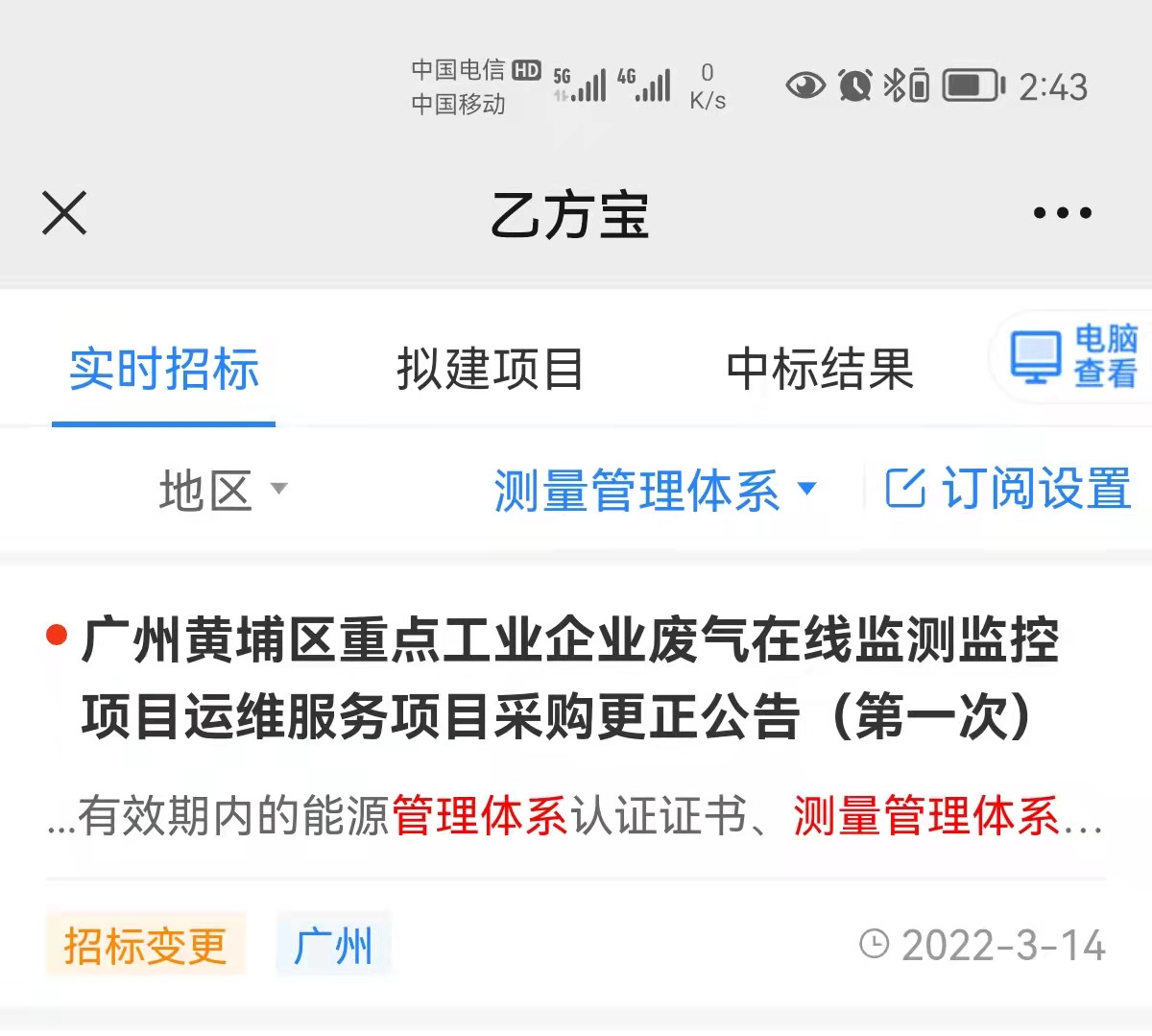 在2022年3月14日第三方的招标信息公告平台中,发布了关于在线监测系统运行维护项目招标文件,其中将ISO10012测量管理体系认证列为加分项。