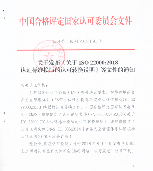 关于发布《关于ISO 220002018认证标准换版的认可转换说明》等文件的通知