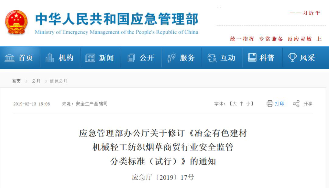 应急管理部重新修订了《冶金有色建材机械轻工纺织烟草商贸行业安全监管分类标准(试行)》,现印发给你们,请参照执行。